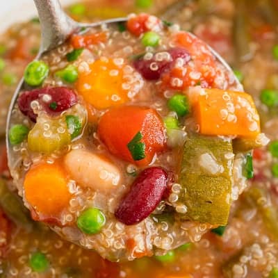 Crockpot minestrone soup is loaded with hearty beans and vegetables but instead of pasta, we added quinoa to make it extra satisfying. Bonus: it practically makes itself in the slow cooker! It’s the low-effort kind of recipe we all need in our weeknight rotation.